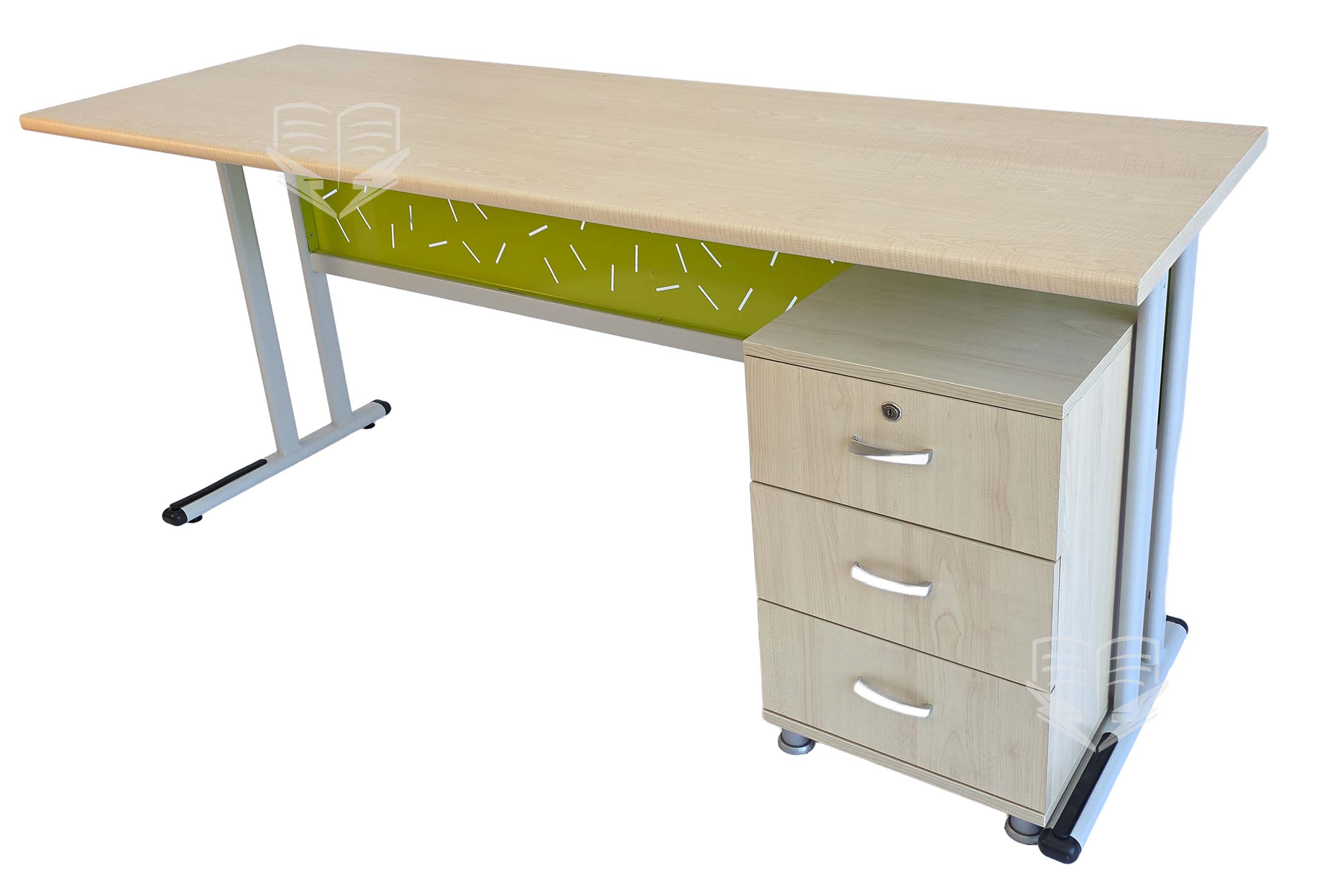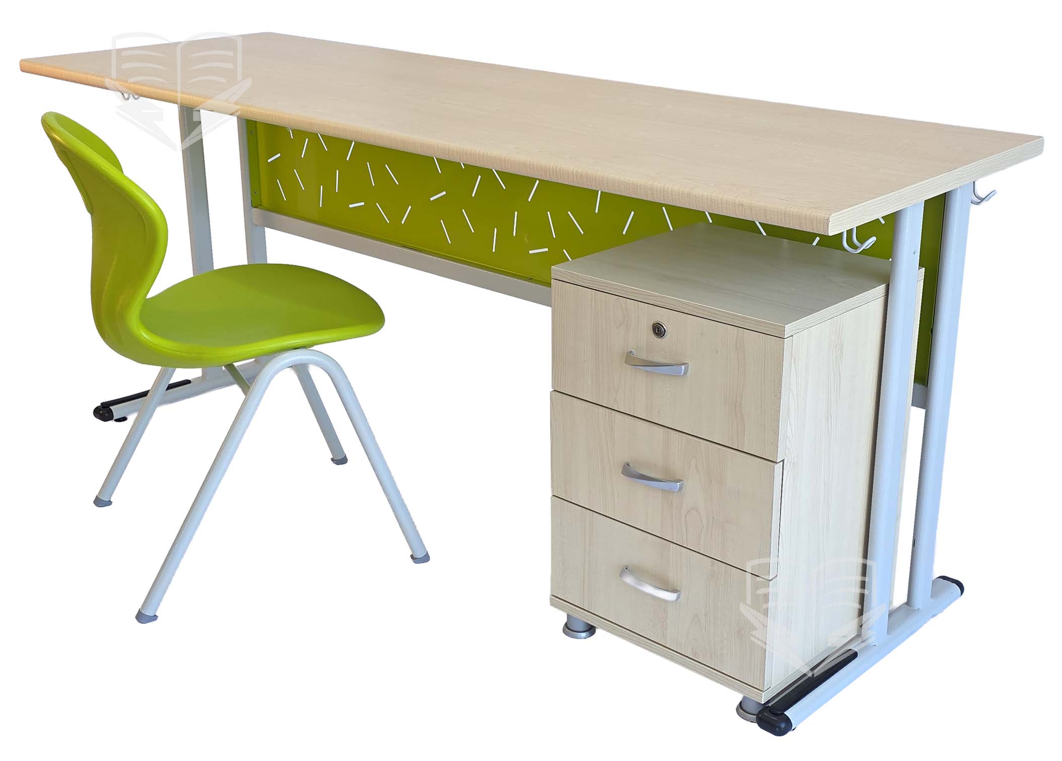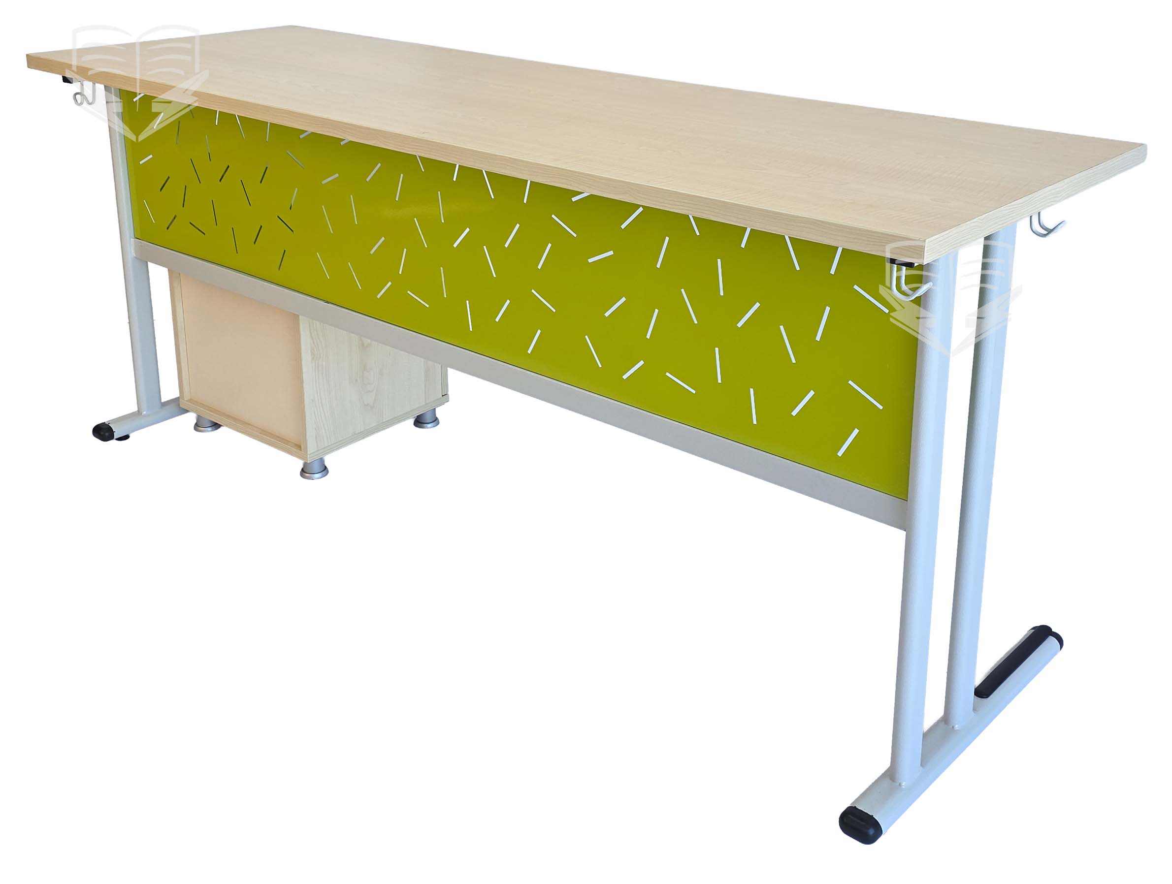Catedra ARGO este dotata cu blat termorezistent, de 28 mm grosime, care are partea de lucru dinspre profesor, latura cu muchii rotunjite. Structura metalica este vopsita in camp electrostatic. Placa frontala este metalica. Catedra este prevazuta cu un corp de tip casetiera, de sine statator, cu 3 sertare, care poate fi pozitionat fie in catedra, fie alaturi, creand astfel un spatiu suplimentar de depozitare. Catedra este dotata cu 4 carlige pentru geanta, doua pe o parte, doua ce celalata. Este prevazuta de asemenea cu piciorusele metalice reglabile pe suprafata pardoselii; picioarele metalice sunt prevazute cu talpi antiderapante pentru protejarea pardoselii.