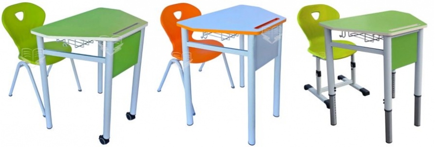 - Set TRAPIX - Blat MDF Laminat: Ideal pentru gimnaziu și liceu. Dotat cu două rotile frontale, acest set permite rearanjarea clasei fără efort. Include un compartiment pentru cărți și un scaun ergonomic stivuibil, disponibil în culori vii (Verde, Portocaliu, Grena, Albastru).