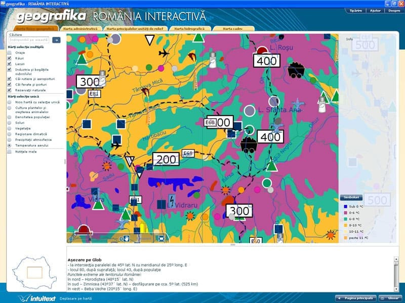 Geografika - România Interactivă este primul produs care transformă reţinerea mecanică a noţiunilor teoretice de geografie într-un proces de învăţare interactivă. Copiii vor putea vizualiza acum pe harta regiunile geografice şi fenomenele care le caracterizează. Geografika cuprinde zeci de hărti interactive, noţiuni teoretice, jocuri, puzzle-uri, sute de teste, toate pentru o pregătire excelentă a tezelor cu subiect unic la geografie.
