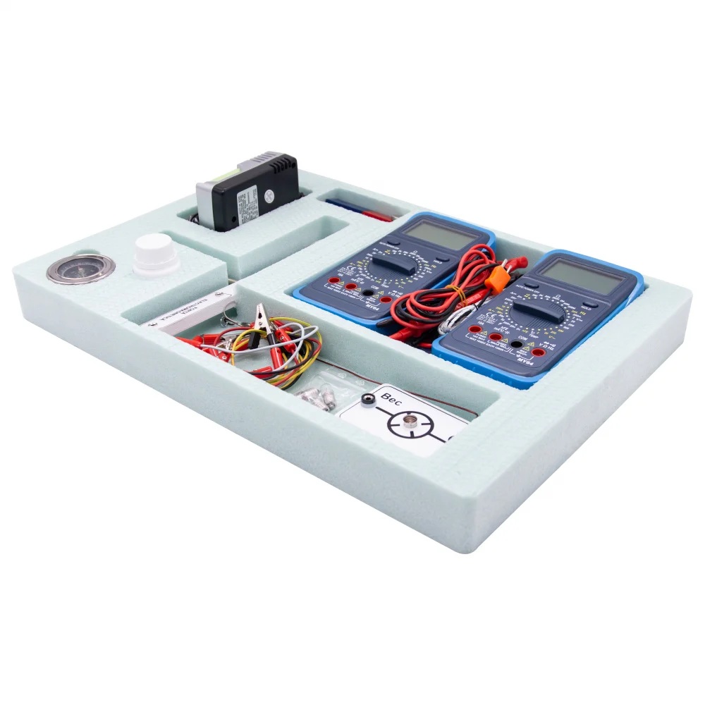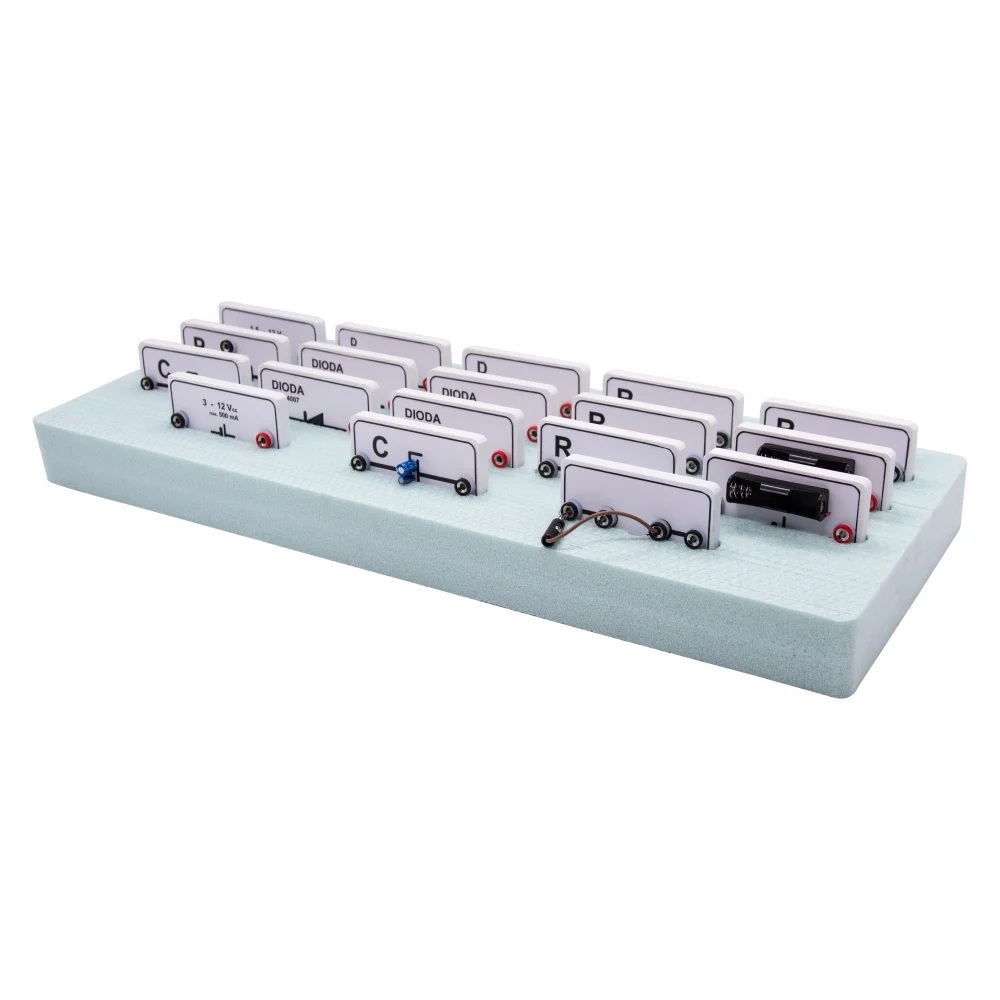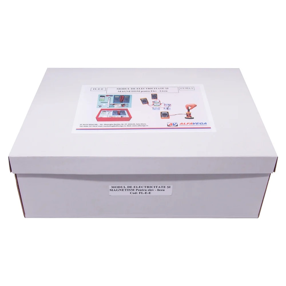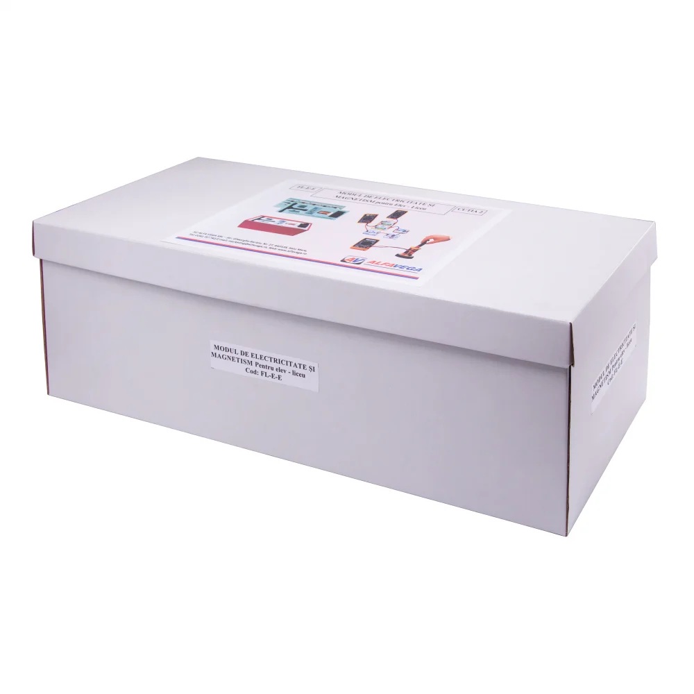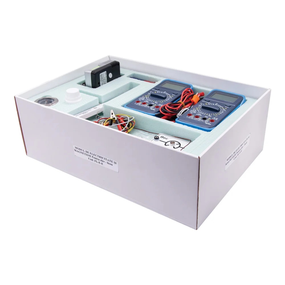 NOUTATI: - verificarea legii lui Lenz - autoinductia - utilizarea LED-ului pentru punerea in evidenta a curentului redresat Modulul este impachetat in doua cutii. Componenta: Modulul are minim 22 componente dintre care: - multimetre, placi cu elemente de circuit (bec, rezistori, potentiometru, diode, condensatori, etc.), busola, bobine, magneti, adaptor sursa, scala, etc. Experimente realizabile: 1. Masuratori electrice 2. Determinarea puterii unui bec electric 3. Verificarea legilor lui Kirchhoff 4. Conectarea rezistentelor 5. Conectarea surselor 6. Studiul fortei electromagnetice 7. Inductia electromagnetica 8. Autoinductia 9. Regula lui Lenz 10. Studiul transformatorului 11. Rezistenta in curent alternativ 12. Bobina in c.c. si in c.a. Inductanta 13. Condensator in c.c. si c.a. Reactanta capacitiva. 14. Studiul circuitului RLC serie 15. Trasarea caracteristicii unei diode semiconductoare 16. Montaje de redresare Componentele sunt stocate in compartimente corespunzatoare formate in placi de spuma poliuretanica si sunt ambalate in cutii de carton rezistente, astfel se asigura stocarea lor ordonata.
