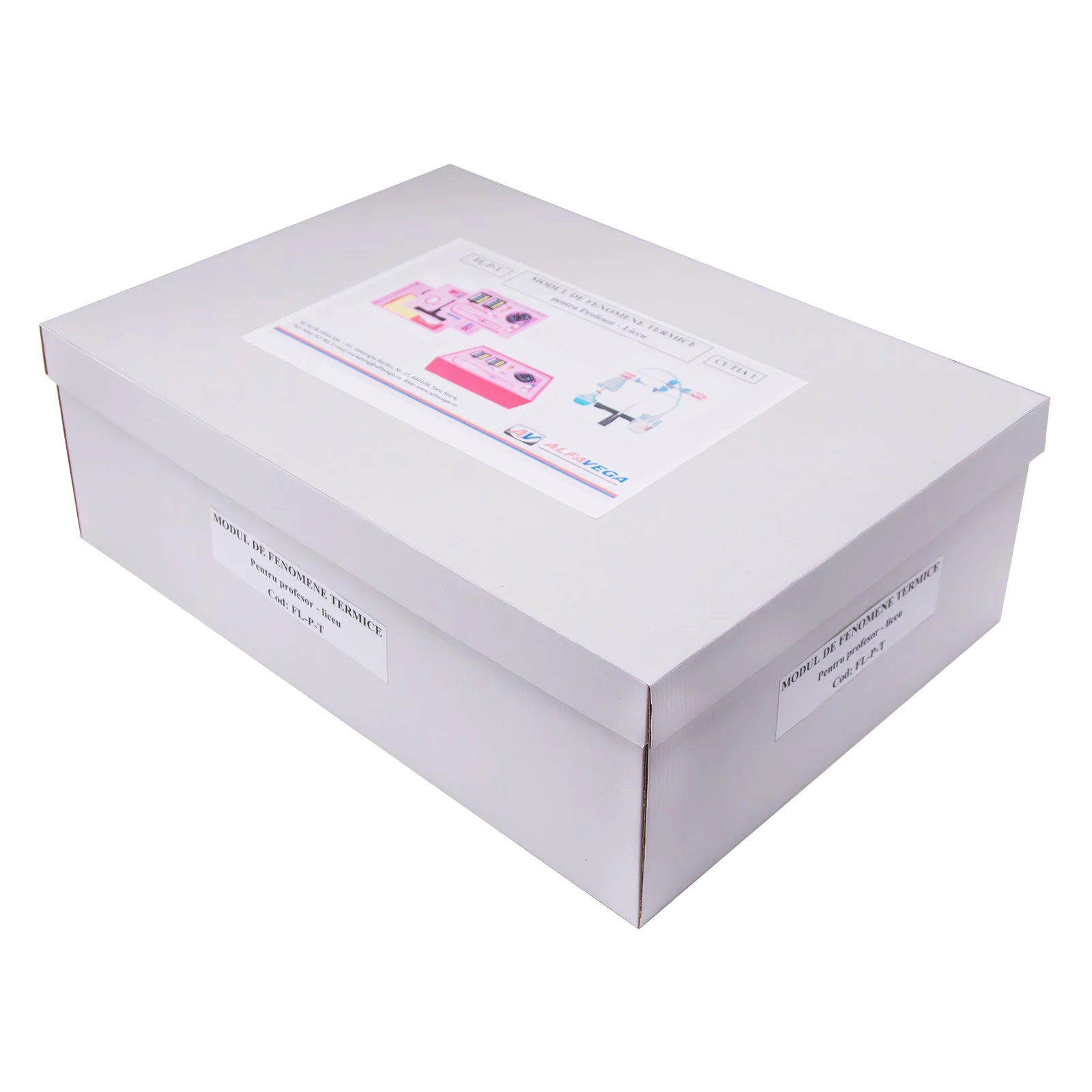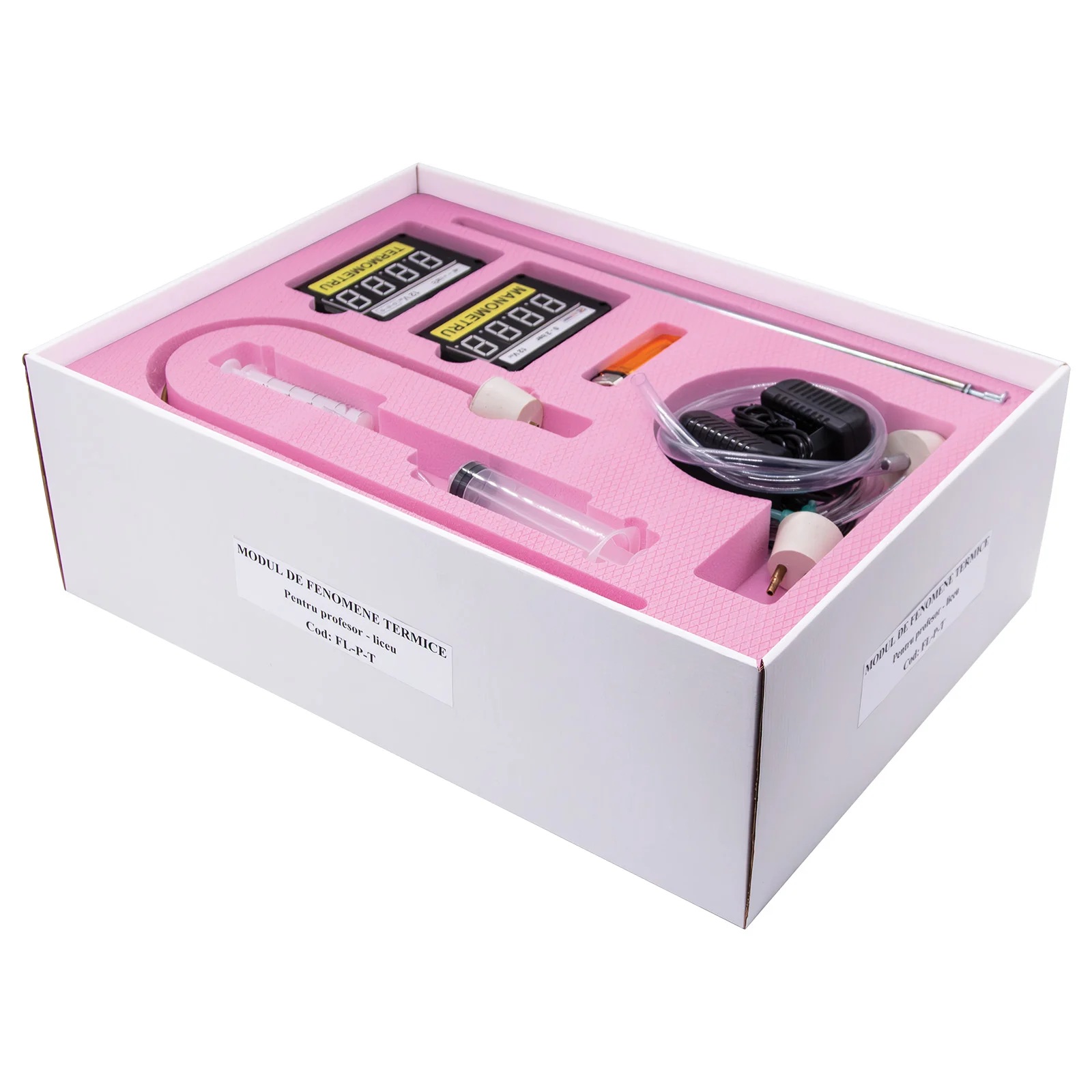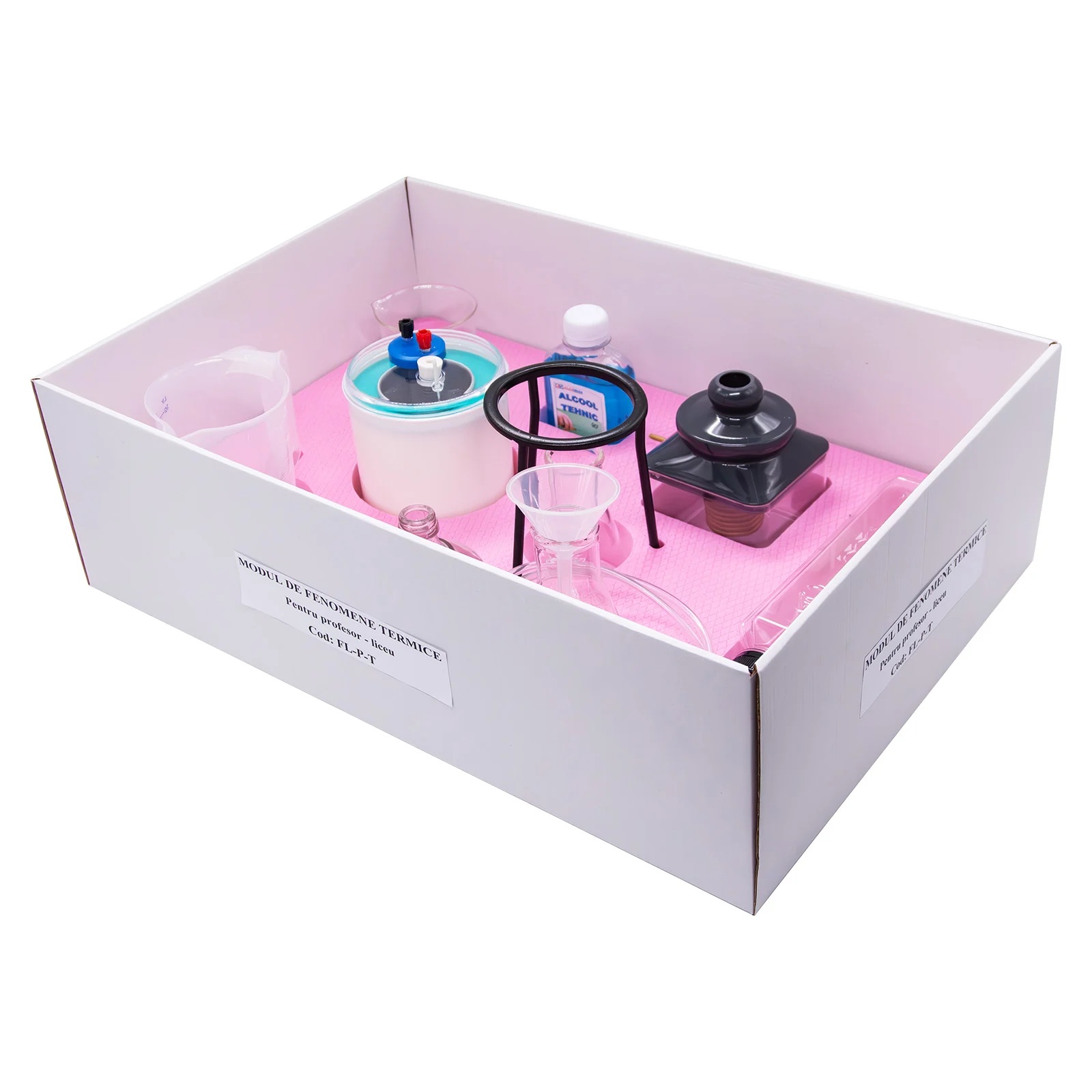 NOUTATI: - fixarea magnetica a componentelor pe placa verticala de montaj - termometru si manometru electronic, verificarea legilor gazului ideal - arderea in spatiu limitat Modulul este ambalat in doua cutii plus tabla vertical de montaj. Componenta: Modulul are minim 33 componente dintre care: - manometru, termometru, aparat de distilare, dop cu sonda de temperatura cu stut de alama, tuburi, spirtiera, naftalina, tave, flacon cu lumanare, calorimetru, vase, palnie, panou vertical de montaj, etc. Experiente realizabile: 1. Masurarea temperaturii 2. Masurarea presiunii 3. Studiul echilibrului termic a doua lichide cu temperaturi diferite. 4. Legile gazelor ideale 5. Calorimetrie: determinarea caldurii specifice a solidelor si a lichidelor 6. Studiul topirii 7. Determinarea caldurii latente specifice de topire 8. Studiul fierberii 9. Condensarea vaporilor 10. Determinarea caldurii latente specifice de vaporizare 11. Fierberea la presiuni mai mici sau mai mari decat cea atmosferica 12. Determinarea randamentului unui incalzitor 13. Distilarea 14. Arderea in spatiu limitat Componentele sunt stocate in compartimente corespunzatoare formate in placi de spuma poliuretanica si sunt ambalate in cutii de carton rezistente, astfel se asigura stocarea lor ordonata.