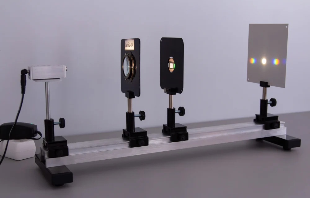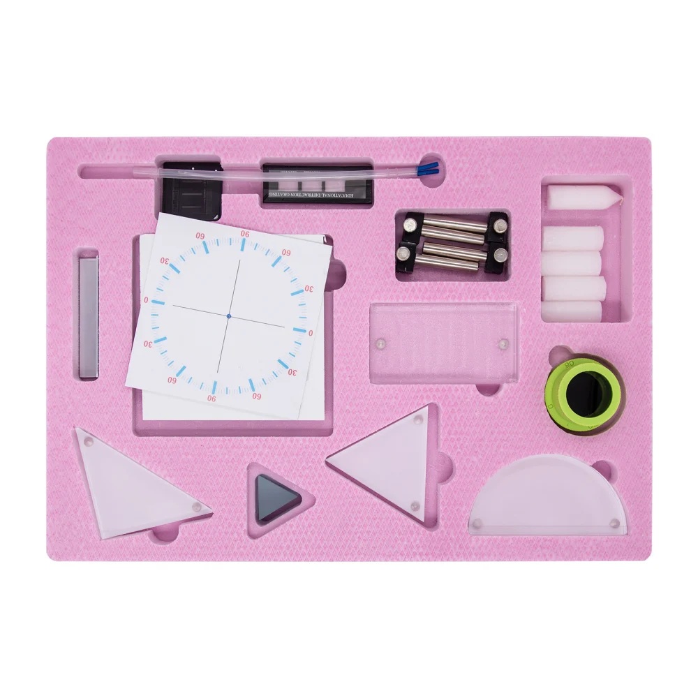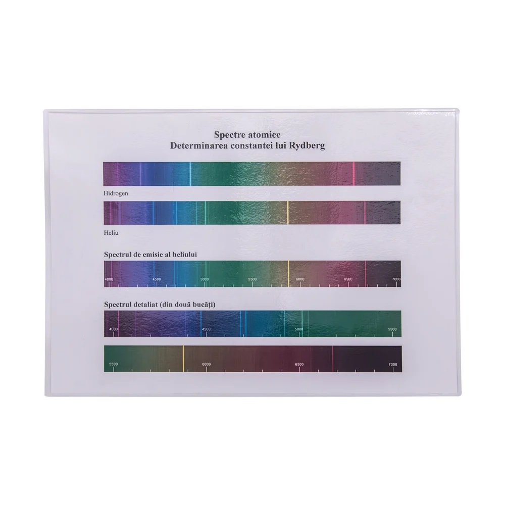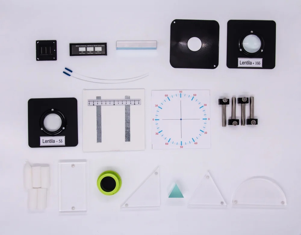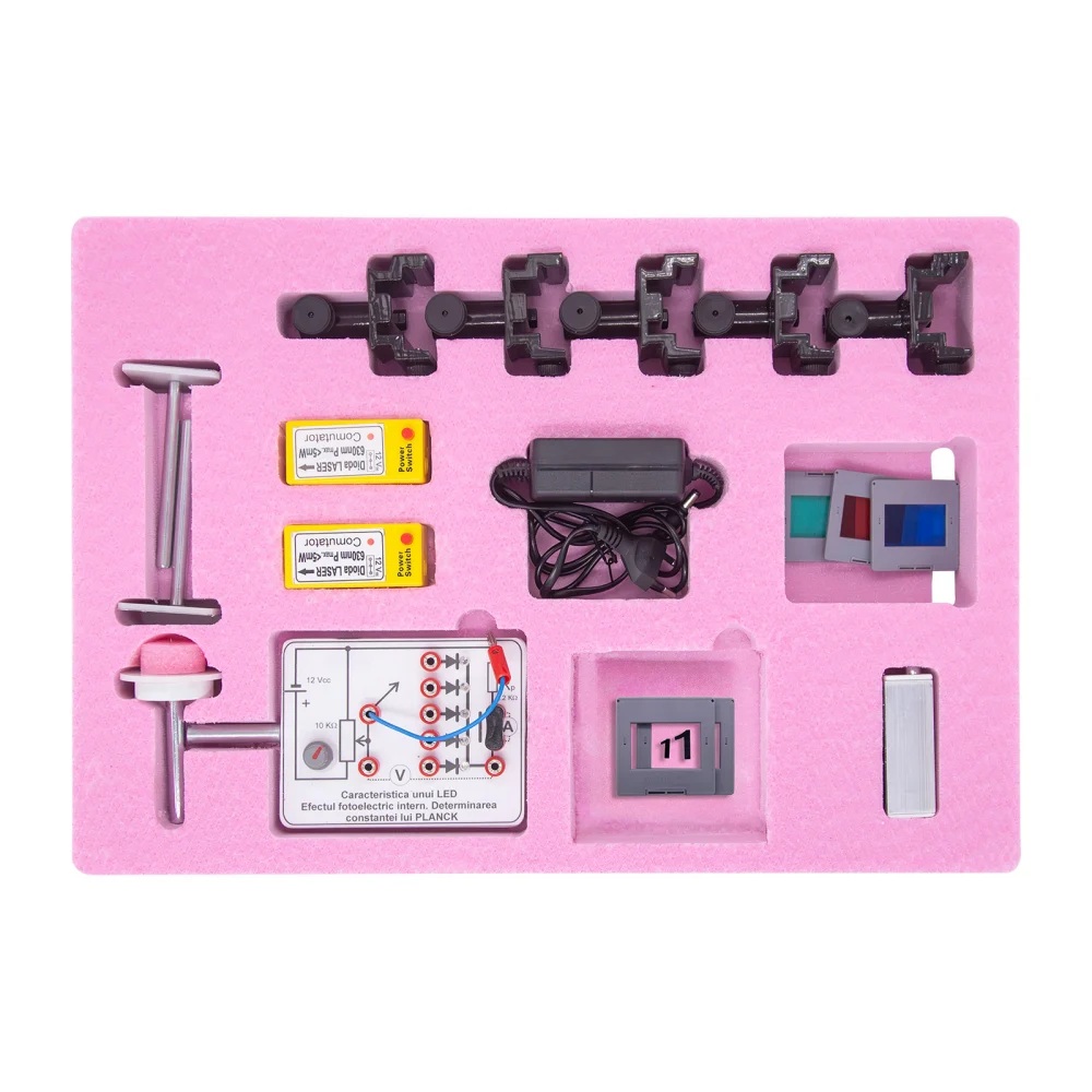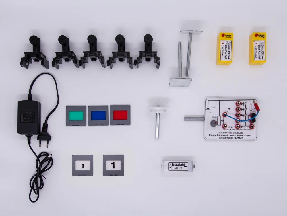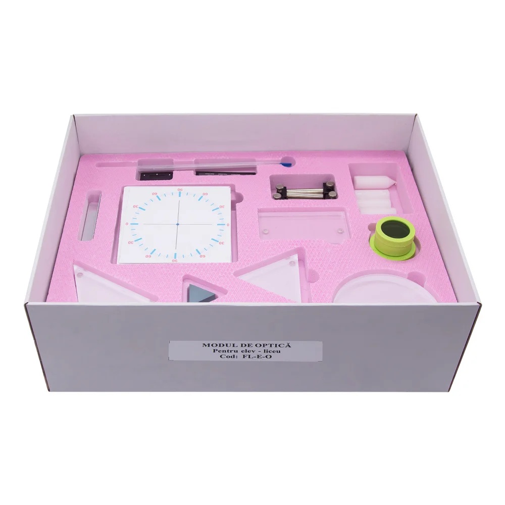 NOUTATI: - difractia in lumina alba - determinarea constantei lui Rydberg - determinarea constantei lui Plank Modulul este impachetat intr-o cutie plus sina de aluminiu. Componenta: Modulul are minim 27 componente dintre care: - sina de aluminiu cu accesorii, diode laser, modele din plexiglas, sursa de lumina alba, lumanari, lentile, fante Young, retele de difractie, prisma, planse, placa cu LED-uri, etc. Experimente realizabile: 1. Reflexia luminii, legile reflexiei 2. Rafractia luminii, legile refractiei 3. Reflexia totala, fibra optica 4. Trecerea luminii prin prisma, prisma de reflexie totala 5. Trecerea luminii prin lama cu fete plane si paralele 6. Determinarea distantei focale a lentilei convergente si lentilei divergente prin formarea imaginii, cu formula lentilelor 7. Dispersia luminii 8. Absorbtia luminii. Fitre optice 9. Interferenta luminii. Experimentul lui Young 10. Difractia pe marginea unui ecran, difractia pe o fanta si difractia pe un obstacol subtire 11. Studiul retelelor de difractie - in lumina monocromatica - in lumina alba 12. Studiul polarizarii 13. Studiul spectrelor. Determinarea constantei lui Rydberg 14. Determinarea constantei lui Planck Componentele sunt stocate in compartimente corespunzatoare formate in placi de spuma poliuretanica si sunt ambalate in cutii de carton rezistente, astfel se asigura stocarea lor ordonata.