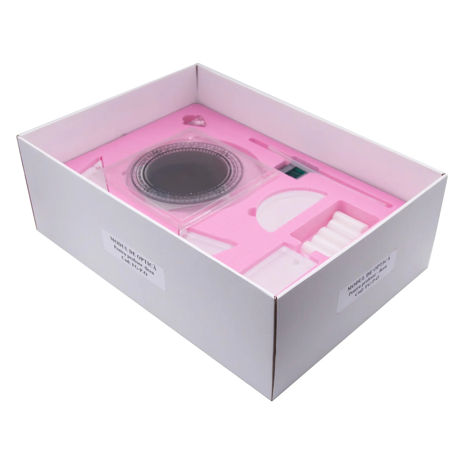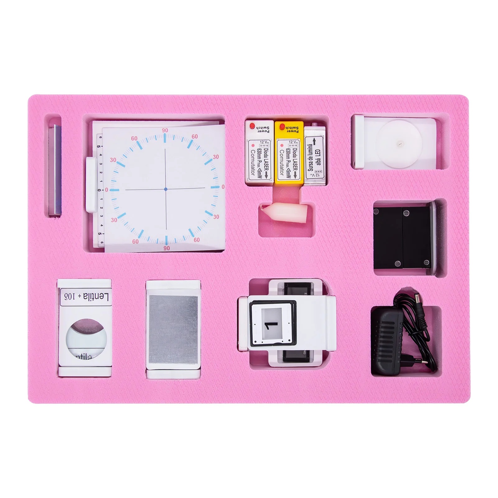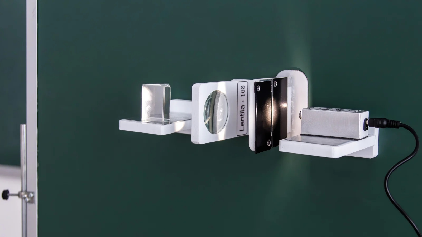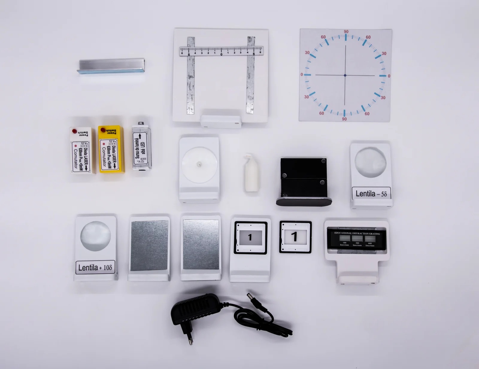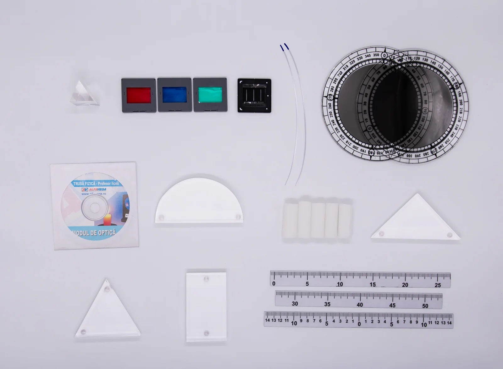 - modele de plexiglas, disc Hartl, filtre, prisma, fante Young, retele de difractie, diode laser, sursa de lumina alba, lentile, suporti, panou vertical de montaj, planse, DVD, etc.