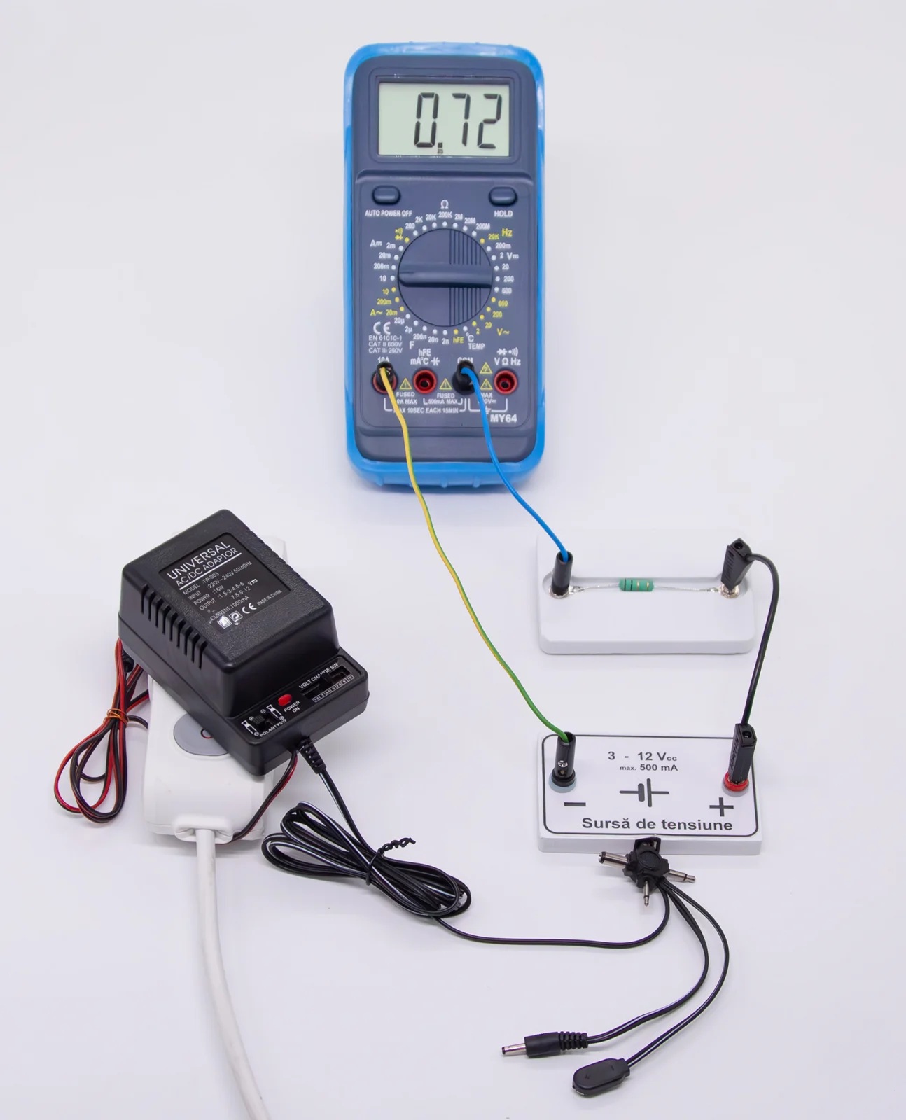 Instrument universal de masura - Multimetru digital cu afisaj LCD 35x61mm, afisaj 1999, tensiune c.c. 200mV - 1000V, tensiune c.a. 200mV - 700V, curenti până la 10A, rezistenta, capacitate, verificarea continuitatii, verificarea diodelor, tranzistoarelor, masurare temperatura si frecventa.