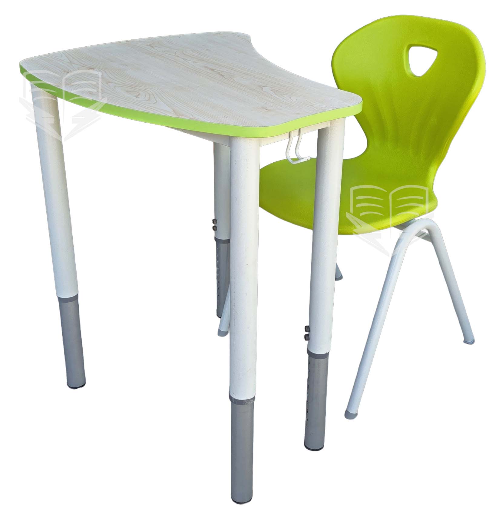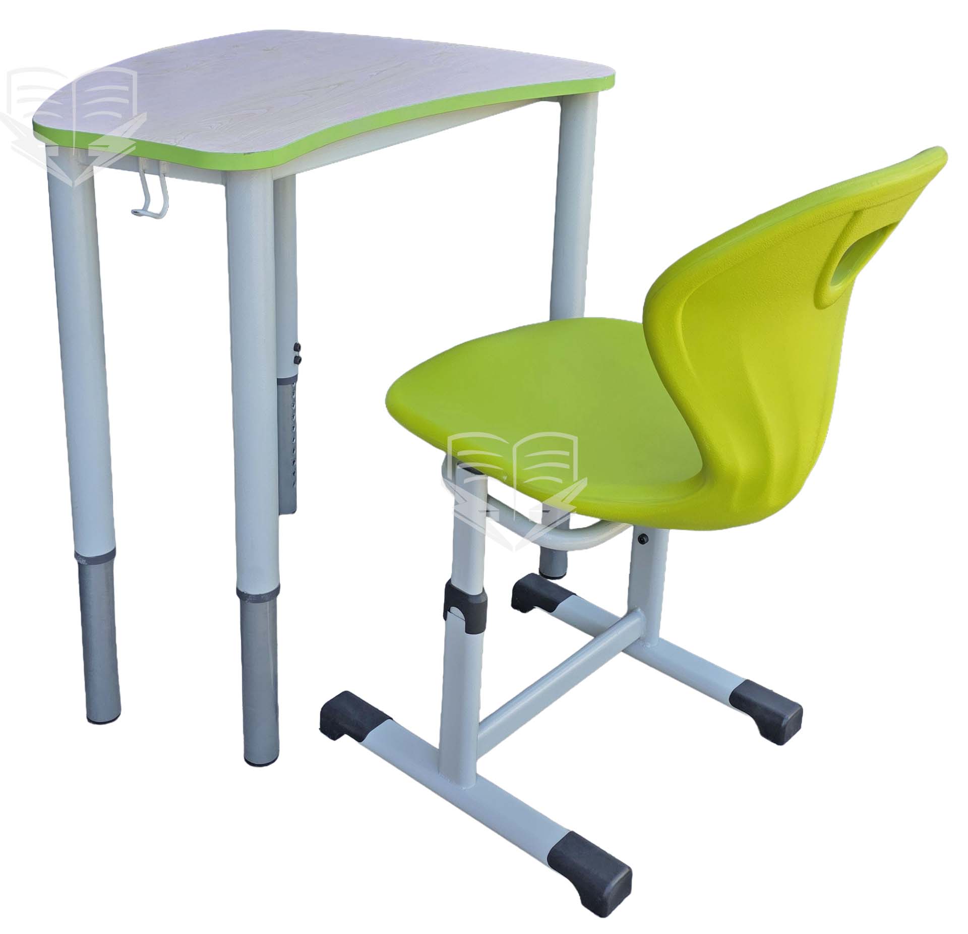 Scaun: Scaunul este reglabil și este confectionat pe o structură metalică din țeavă ovală robustă, vopsită în câmp electrostatic, iar șezutul foarte rezistent este tip scoică, ergonomică, ceea ce îi conferă un plus de confort la utilizare. Spătarul oferă o oarecare flexibilitate față de șezut și oferă suport lombar pronunțat, încurajând o bună poziție și respirație a elevului. Ideal pentru săli de clasa, cabinete, laboratoare, săli de studiu. Scaunul este dotat cu picioruse antiderapante care protejeaza pardoseala.