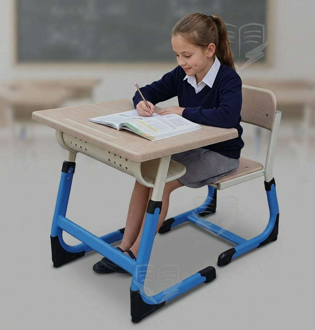 1 elev (bancă scolara și scaun elev), aerisit, stabil, robust și reglabil în trei trepte de înălțime;