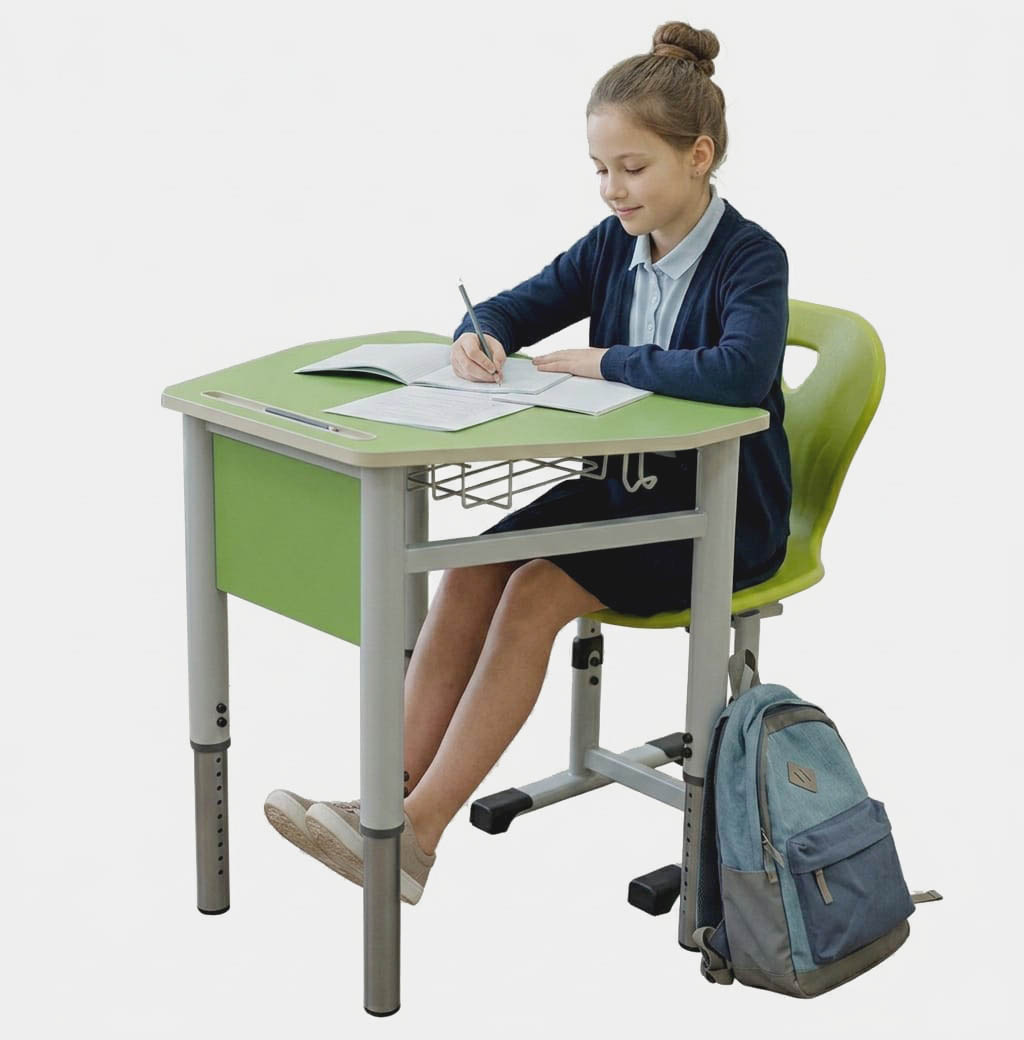 Scaun: Scaunul este reglabil și este confectionat pe o structură metalică din țeavă ovală robustă, vopsită în câmp electrostatic, iar șezutul foarte rezistent este tip scoică, ergonomică, ceea ce îi conferă un plus de confort la utilizare. Spătarul oferă o oarecare flexibilitate față de șezut și oferă suport lombar pronunțat, încurajând o bună poziție și respirație a elevului. Ideal pentru săli de clasa, cabinete, laboratoare, săli de așteptare, cămine.