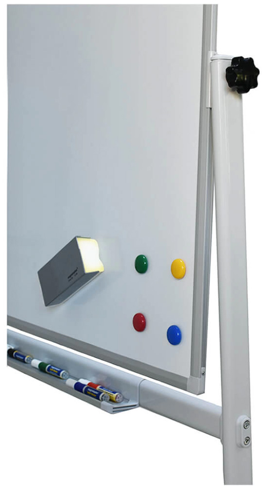 Aceasta tabla alba cu 2 fete ofera o suprafata dubla de prezentare si posibilitatea de a o muta oriunde aveti nevoie. Tabla este montata pe un cadrul din otel rezistent, cu 2 bare pentru rigidizare. Pentru un zgomot cat mai redus, tabla are 4 roti siliconate (2 roti au sistem de blocare). Suprafata de afisare este alba, magnetica. Se poate scrie cu markere de tabla sau se pot afisa documente cu ajutorul magnetilor. Tabla are in lateral (dreapta) un sistem ce permite rotirea la 360 de grade. Accesoriile pot fi depozitate pe tavita culisanta ce se monteaza cu doua carlige pe bara de rigidizare a tablei.