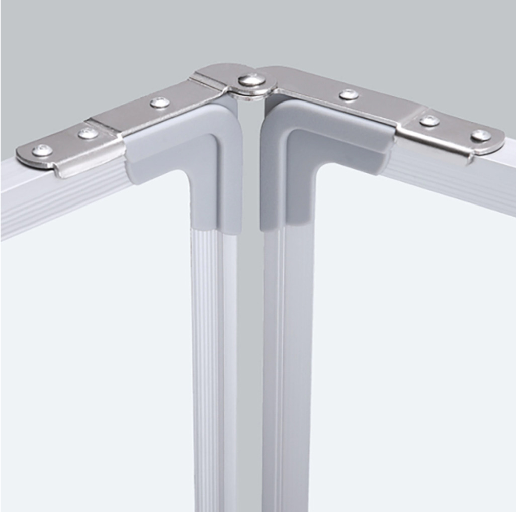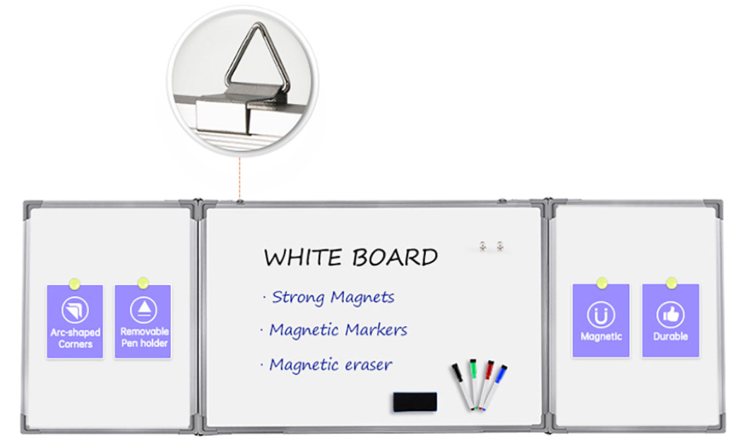 Aceasta tabla triptica alba cu 5 fete ofera o suprafata utila care totalizeaza 120x600cm. Cele trei panouri (unul central fix si doua laterale pliabile) permit scrierea simultana a mai multor teme sau capitole, fara a sterge notitele anterioare. Suprafata magnetica alba asigura o scriere fluida cu markerele nepermanente si se sterge usor, fara urme. Permite prinderea documentelor cu magneti. Rama este confectionata din aluminiu, ceea ce ofera atat o buna rezistenta, cat si un aspect modern. Este conceputa pentru montarea pe perete si dispune de 6 agatatori metalice, care se fixeaza pe perete prin dibluri cu holsuruburi (incluse)