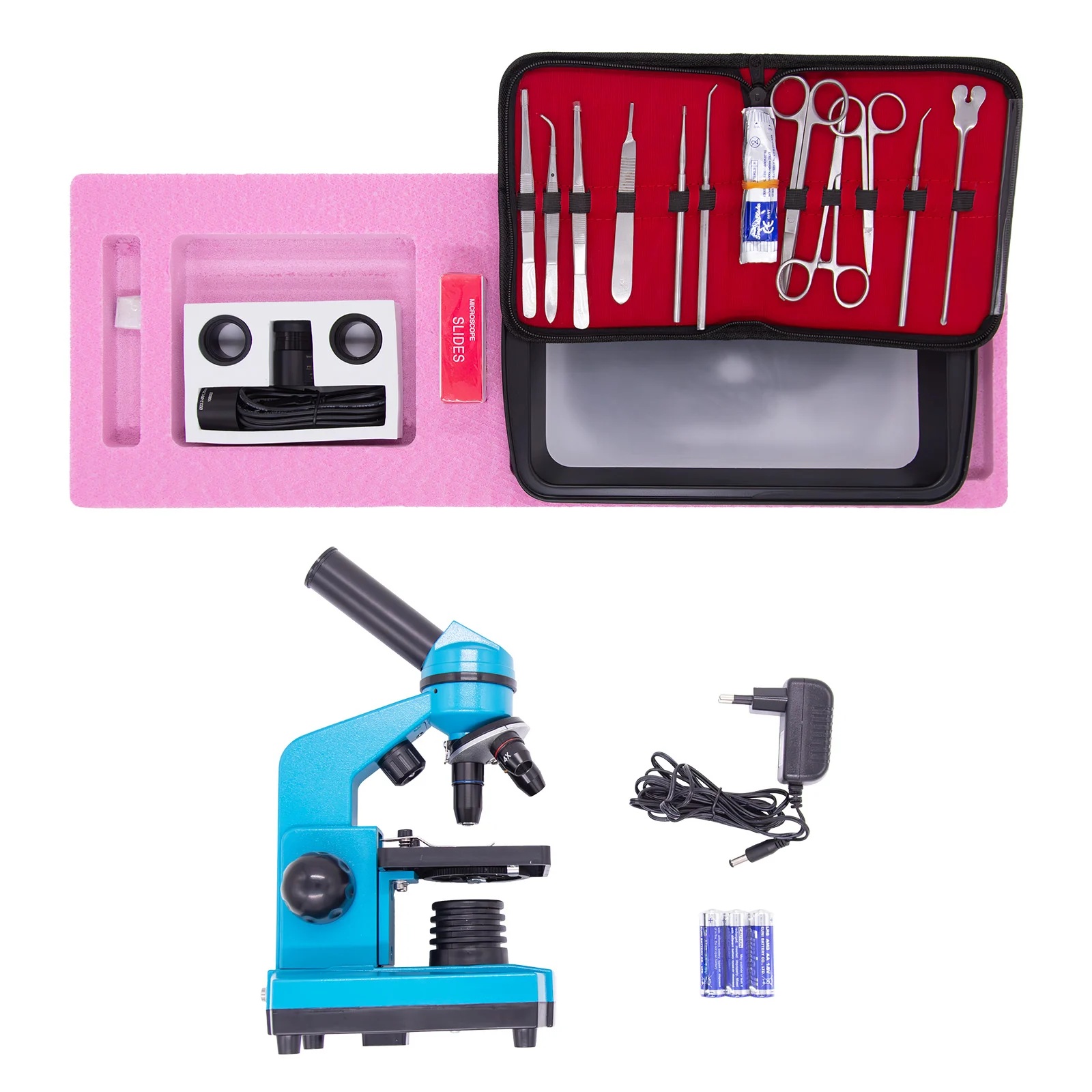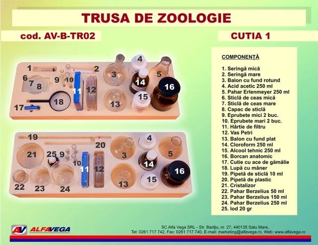 Această trusă completă este destinată studiului structurilor și funcțiilor organismelor animale, de la nevertebrate până la vertebrate. Este ideală pentru activități de laborator din cadrul lecțiilor de biologie, oferind elevilor posibilitatea de a realiza observații practice și experimente biologice complexe.